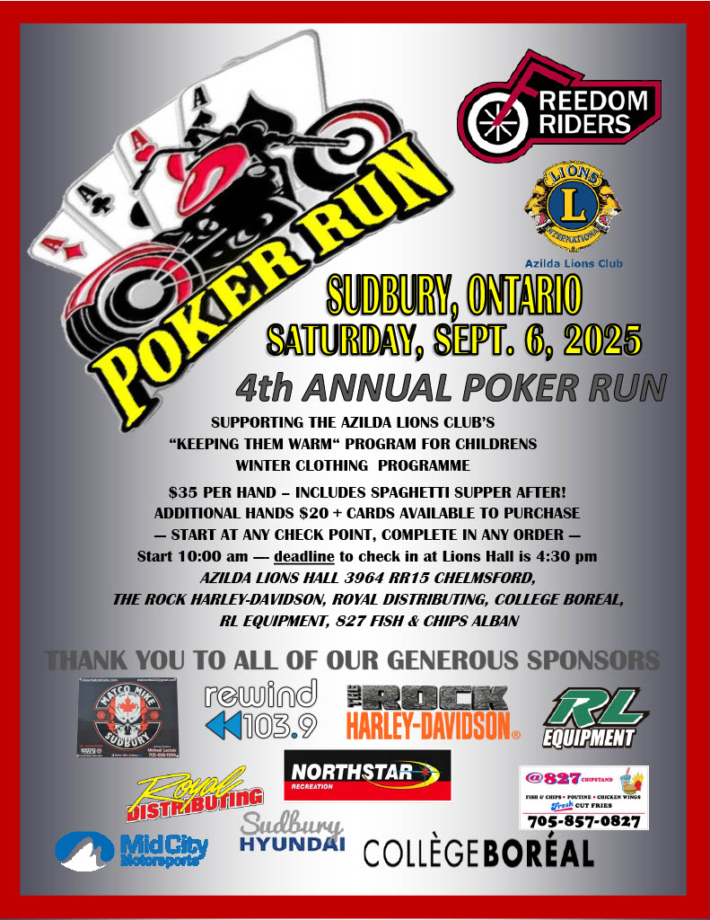 REGISTRATION STARTS AT 10:00 AT ANY CHECKPOINT LOCATION; ENDS AT THE AZILDA LIONS HALL BY 4:00 pm DEADLINE (3964 RR15 Chelmsford). Checkpoints are The Rock Harley-Davidson, College Boreal, Royal Distributing, RL Equipment, and the Azilda Lions Hall.